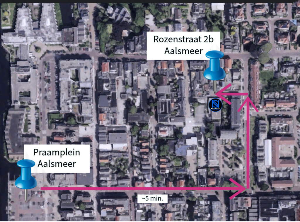 Wanneer je een les, training of evenement bij Noordzij Sports volgt in gymzaal De Rozen (Rozenstraat 2B, Aalsmeer), kun je het beste parkeren op het Praamplein.
